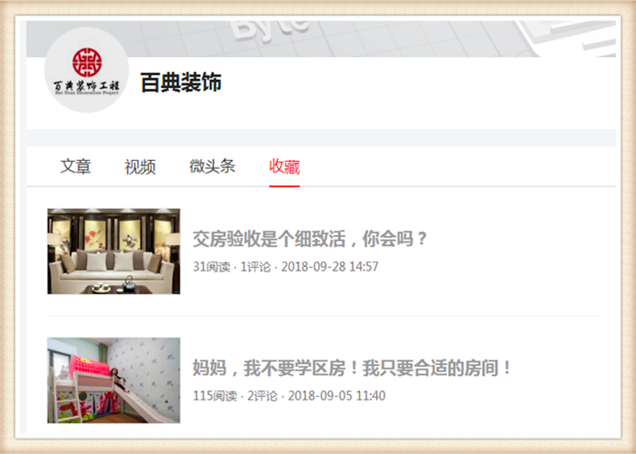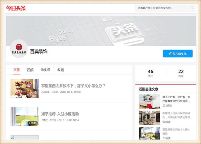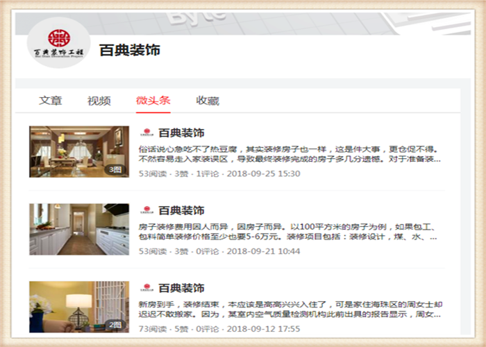 苏州百典装饰工程有限公司,为了服务更多的客户,经历重重难关,一层一层的审核,最终与“今日头条”达成合作,强势入驻,并借此平台帮助更多的苏州市民分辨真假,增长专业知识,了解装修市场行情,了解自家装修情况。