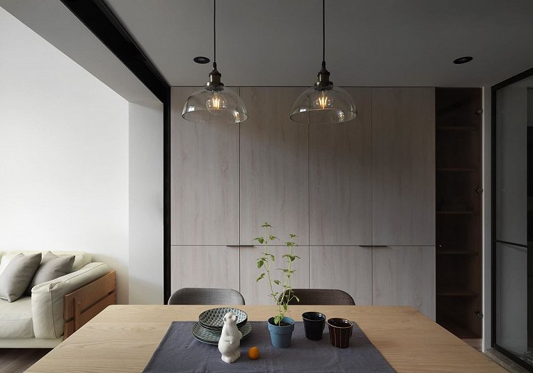 首先,楼梯改为隐闭于电视墙内侧,化去明显的阶梯量体,让公领域更形完整;接着,去除了客厅后方原有的隔间,打开空间设置餐厅,形成开放串联的流畅动线,也让光线得以穿堂入室,厨房虽以玻璃拖拉门区隔,但视觉光线仍然通透无碍;主卧则位移至最后端,门片与床头以蓝灰壁布互相呼应,更以开天窗引光的手法,解决采光不足的困扰。