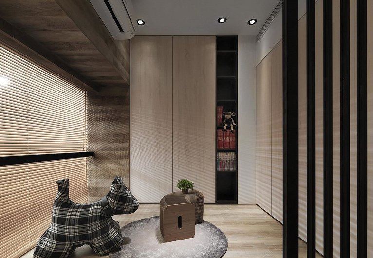 二楼则是小朋友的专属空间。设计师微调格局,将两间次卧大小略做调整后,在面向挑高客厅处增设为可当作游戏室的多元起居空间,以格栅为门片、窗帘作隐私屏蔽,拉起时,在视觉上得以与客厅上下串联对望;放下时,就是一间独立客房。