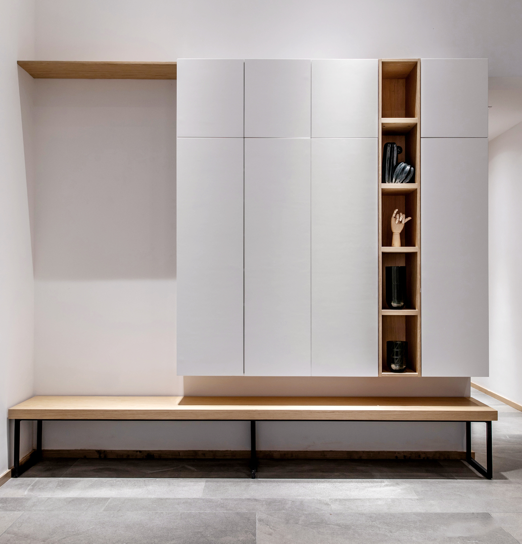 鞋柜内鞋子的置放方式有直插、置平、斜摆等方式,不同方式会使柜内的深度与高度有所改变,而在鞋柜的长度上,以一层要能放2~3双鞋为主,千万不要出现只能放半双(也就是一只鞋)的空间,这样的设计是最糟糕的设计。